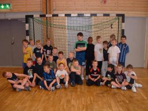 Vit tröja "Handboll i Handen", röda byxor. HSK-logo på båda.