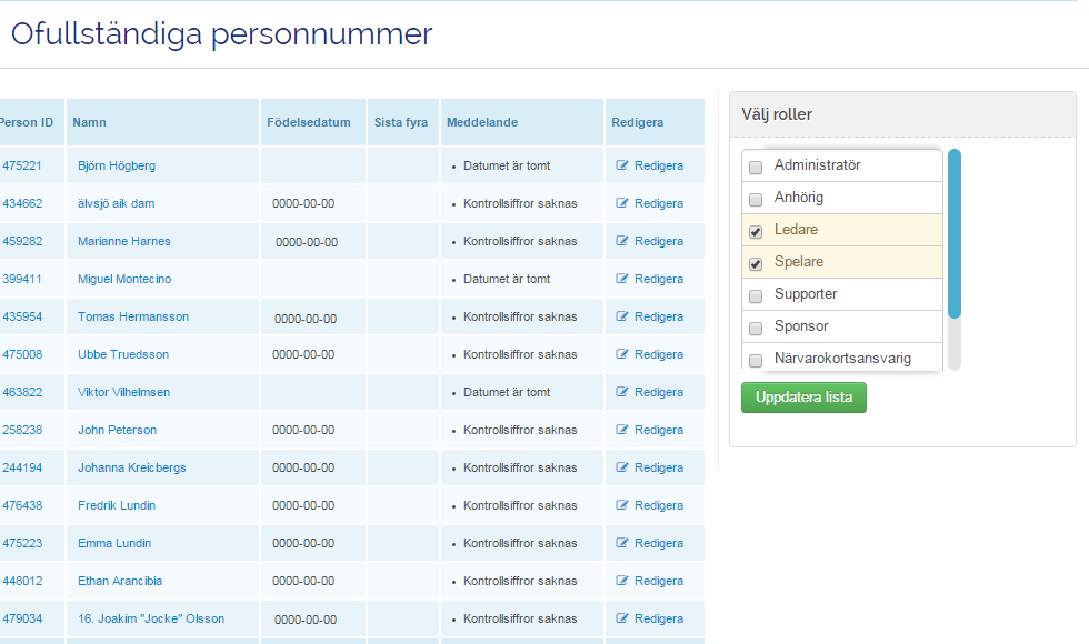 Nu dyker alla medlemmar med vald roll upp som inte har korrekta personnumer.
