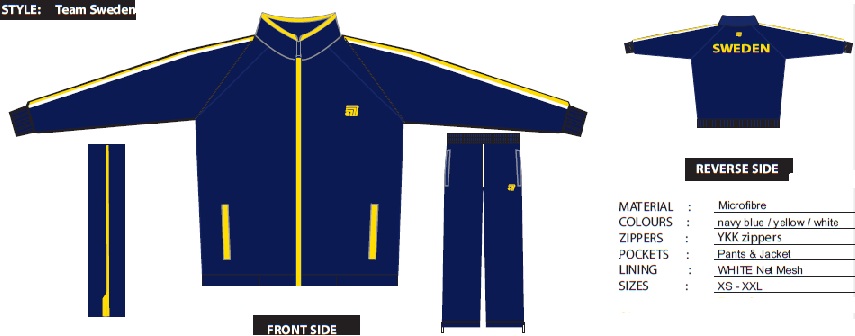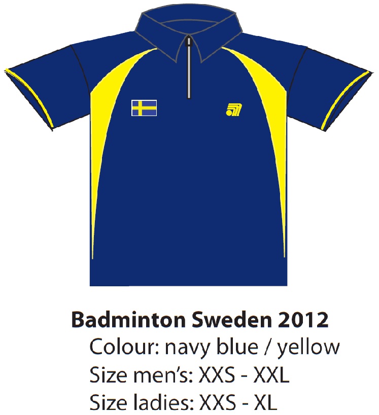 Ovan priser är inklusive moms, tryck av "Badminton Sweden-loggan, "Sweden" och "efternamn" på speltröjorna, samt "Sweden" på overallen. Dessutom inkluderas kostnaden för frakt till 5 olika orter i Sverige för distrubition.