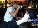 Efter Curts trasiga hälsena under landskampen på torsdag em så väntade vi otåligt på varje ny rapport från sjukhuset dit han skjutsats. Efter olika besked om operationstid så blev han till slut opererad på fredag eftermiddag fick vi veta. Arrangörerna lade ner sin själ i Curts välbefinnande. Så fort han skadats avdelades ett par (Erik med maka) att skjutsa honom till sjukhuset. De väntade med honom och tog hand om honom på alla sätt och vis, och inte förrän han var inlagd (på sjukhus nr 2, ett lite större) så vek de från hans sida. Det var också dessa som hämtade honom på lördagen när han blev ”utsläppt” och såg till att han kom tillbaka till hallen.